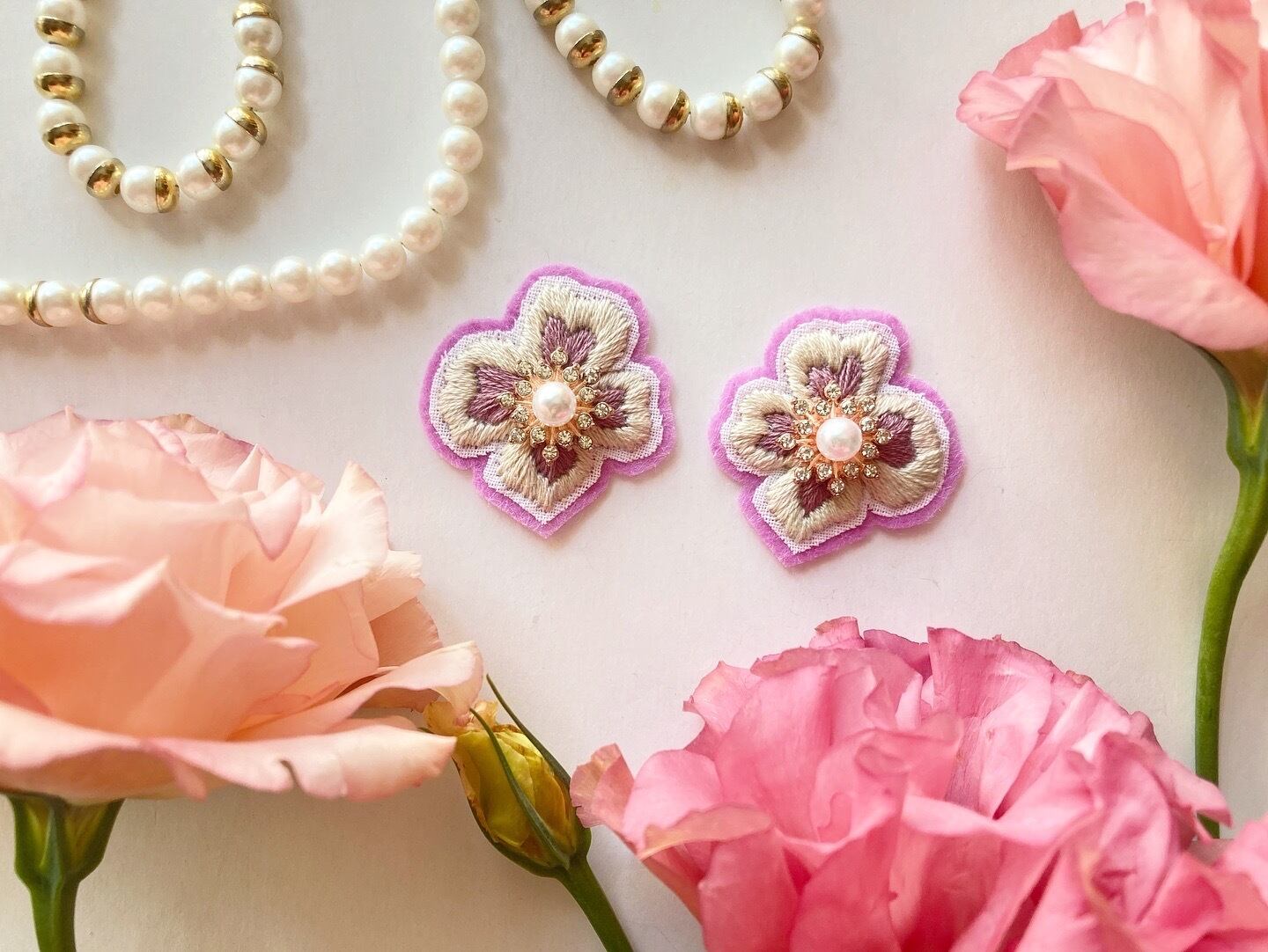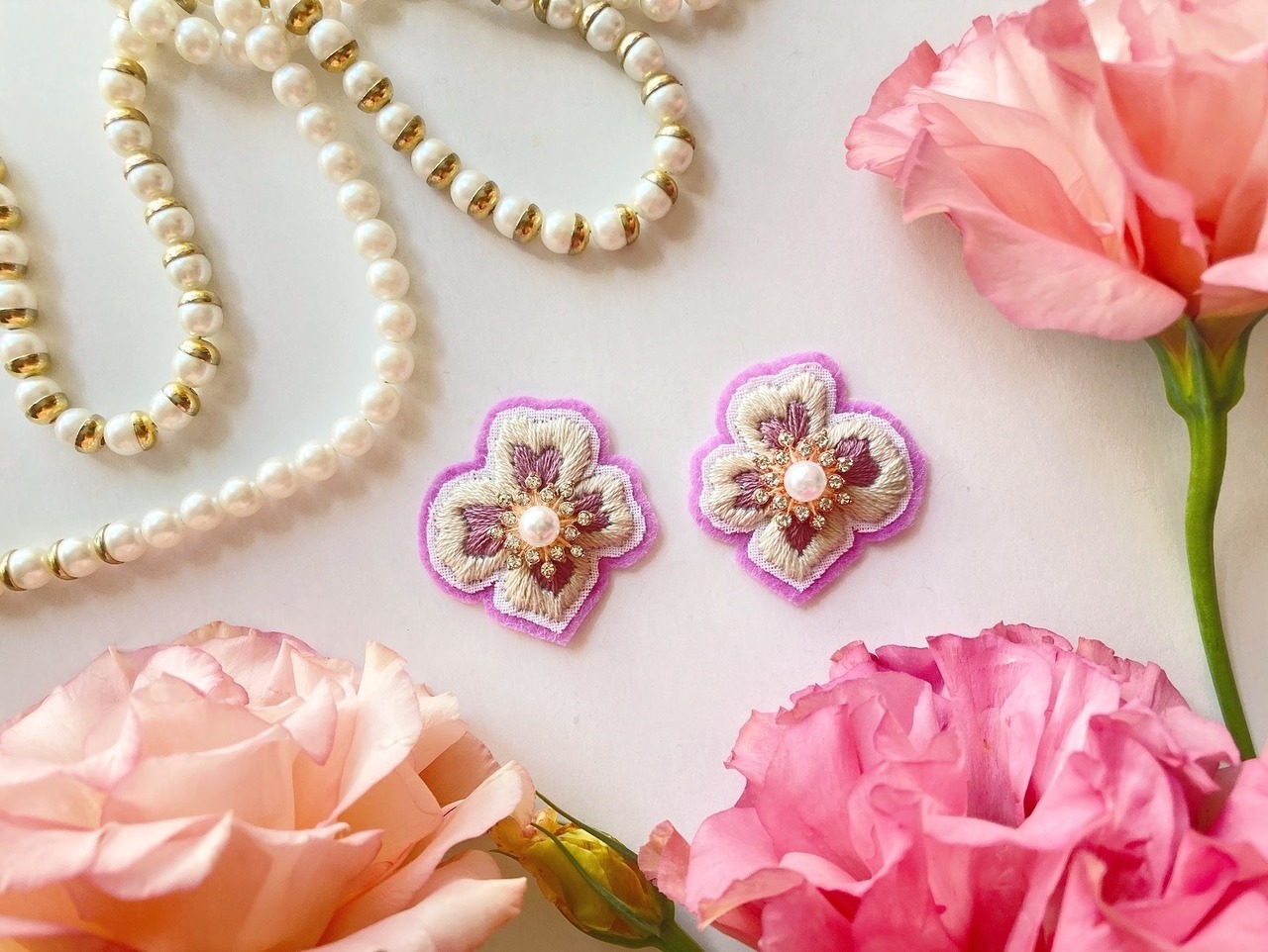 彩りのある刺繍花やパールアクセサリーなどを製作。